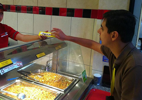 Antonio uses PECS to order Chinese food at a restaurant. Phase IV of PECS is shown.